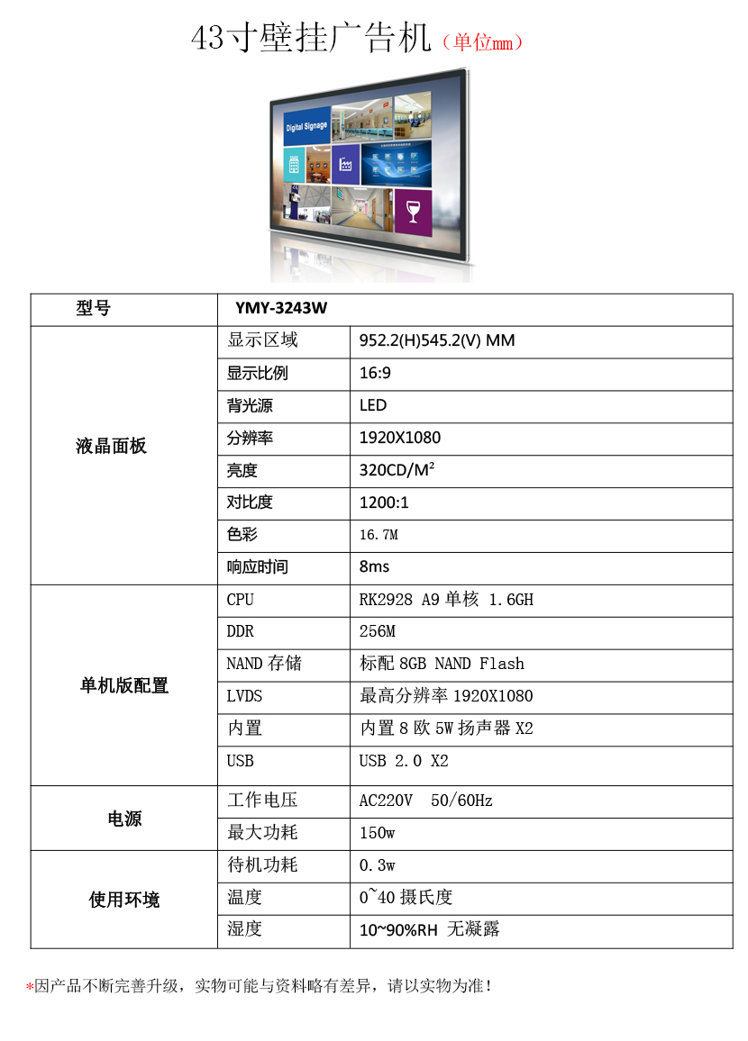 43寸壁掛式單機(jī)版廣告機(jī)