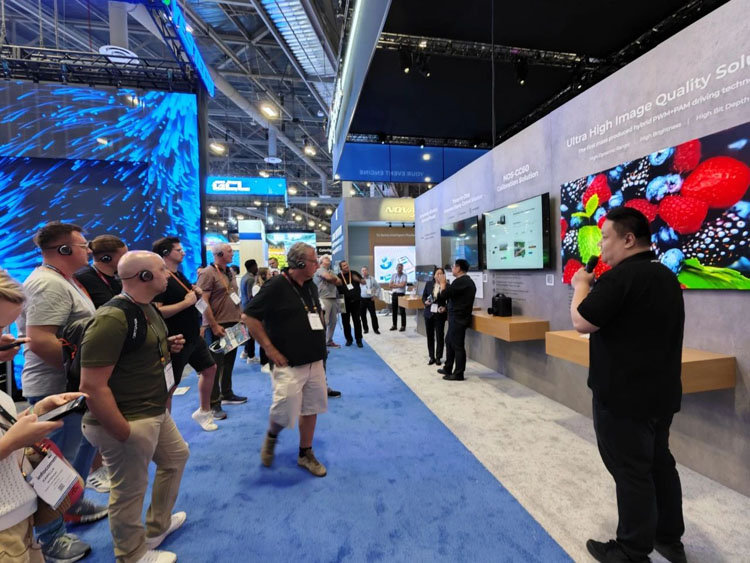 展會(huì)第一天就吸引了諸多客商圍觀(guān),展現(xiàn)出極高的吸睛力??蛻?hù)對(duì)產(chǎn)品展現(xiàn)的極高的色域(DCI-P3色域99.93%)、超高對(duì)比度(靜態(tài)65000:1)與動(dòng)態(tài)對(duì)比度(1000000:1)、超高刷新率(≥7680)等指標(biāo)搭配驚艷的視頻讓客戶(hù)體驗(yàn)了極致的視覺(jué)觀(guān)感。